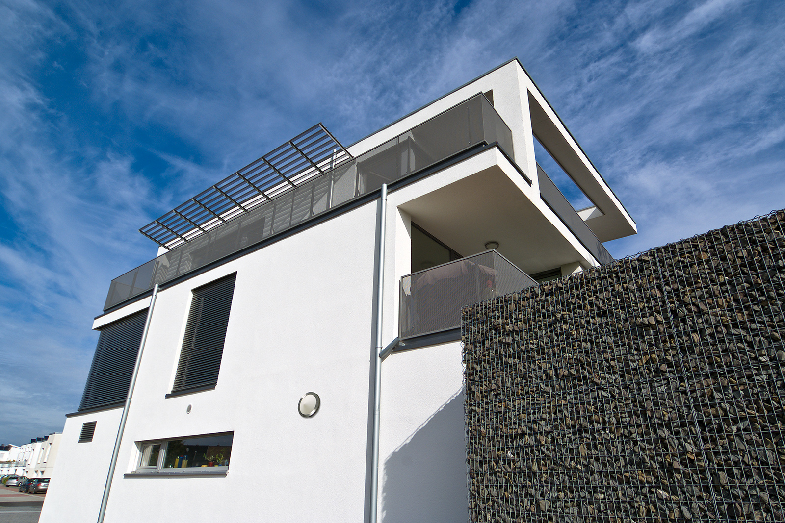 Die Penthousewohnung hat zudem eine umlaufende etwa 80qm große Dachterrasse, die Wohnungen im Obergeschoss jeweils eine Loggia.