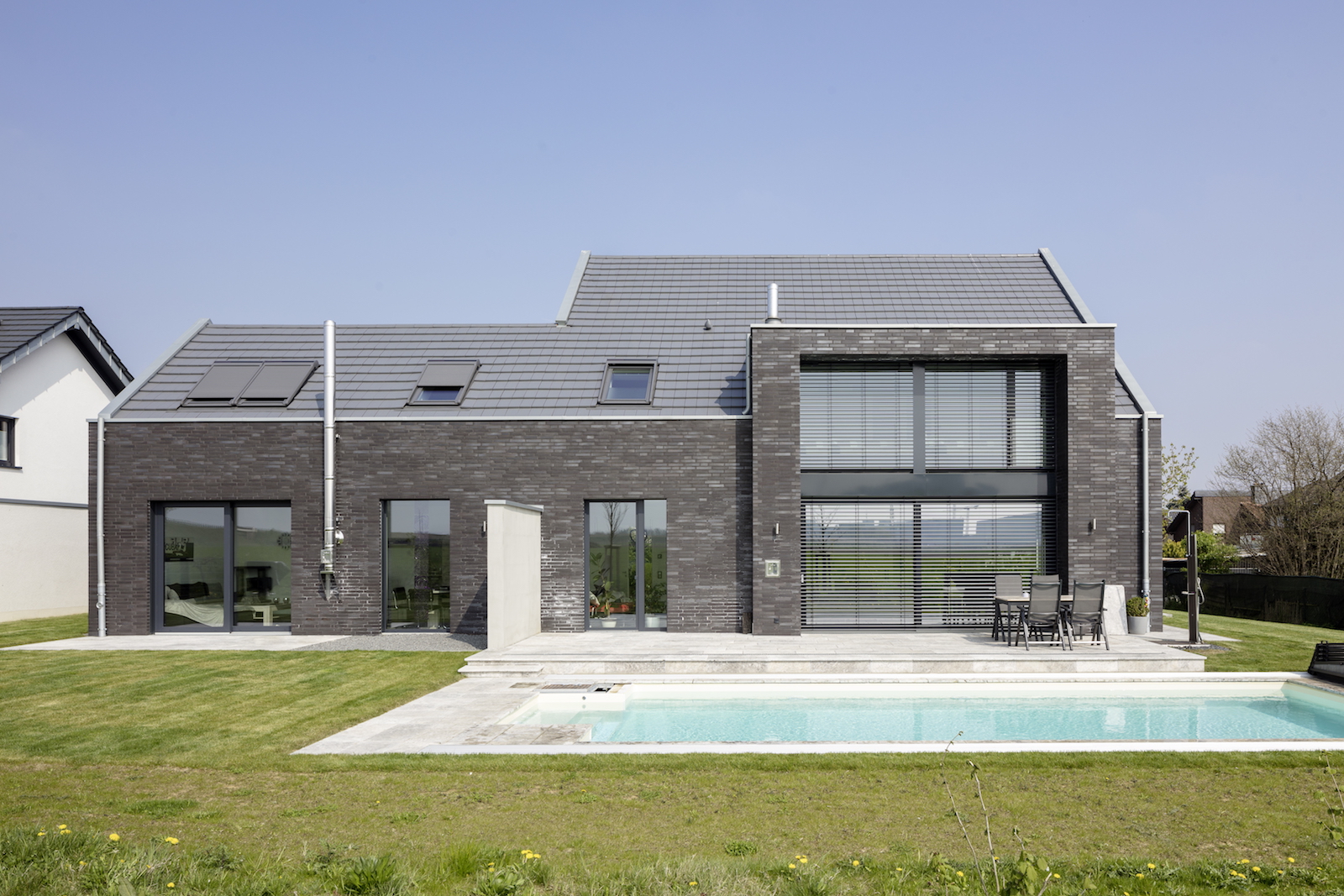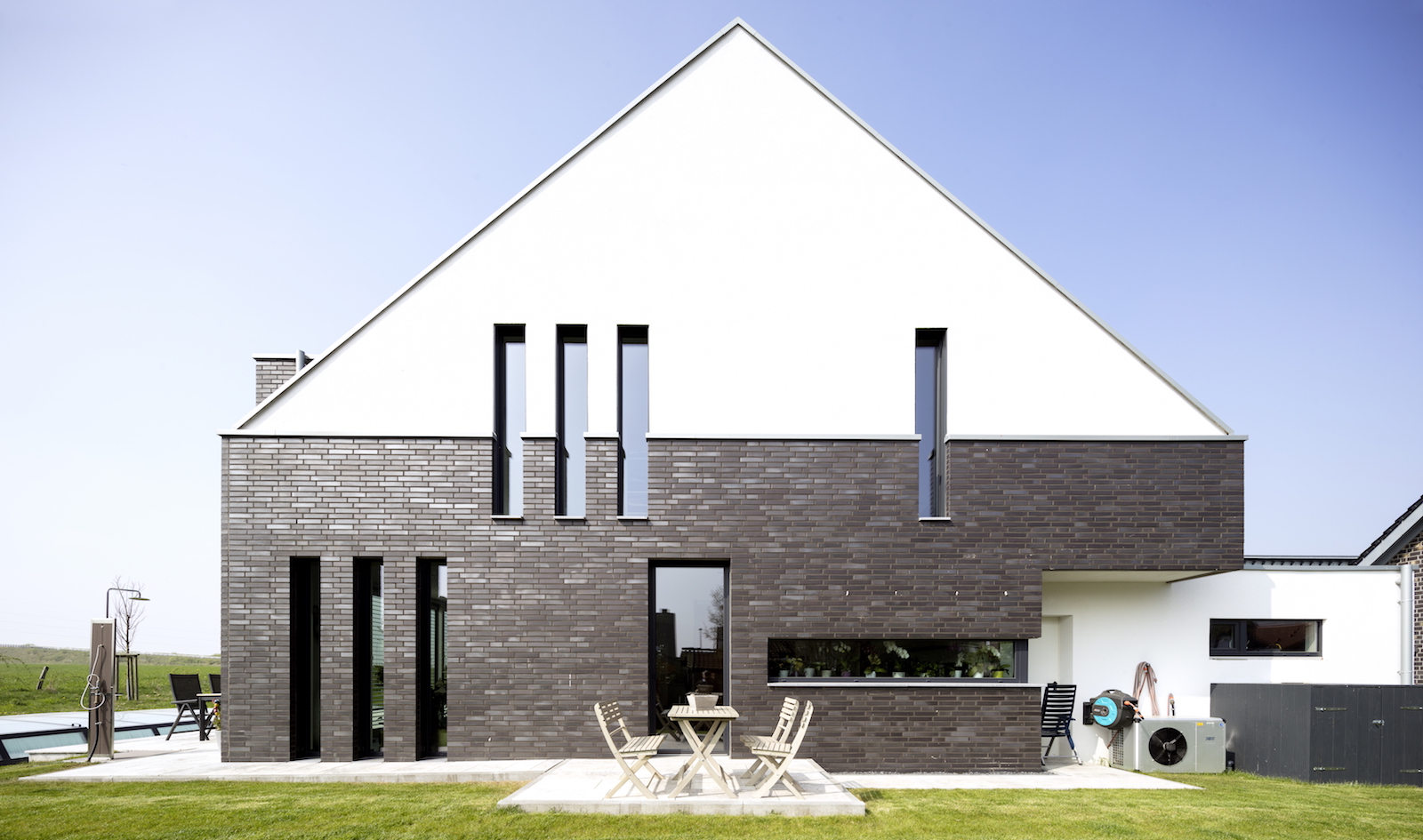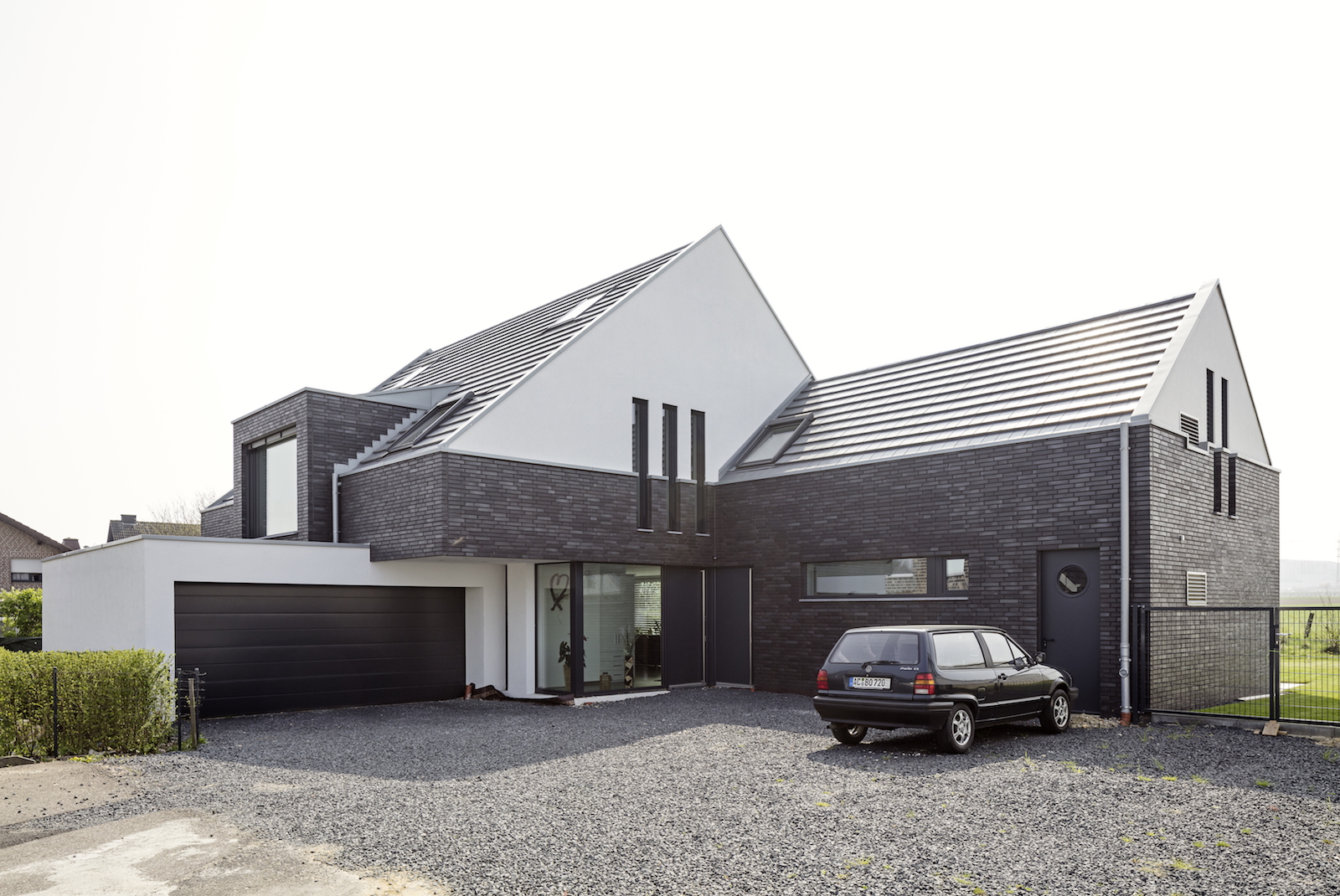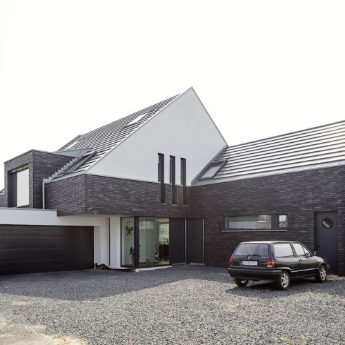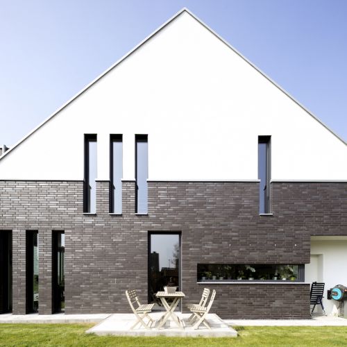 Die Fassade ist in einem Wechsel mit schwarzen Klinkersteinen und weissen Putz kontrastreich gestaltet.
