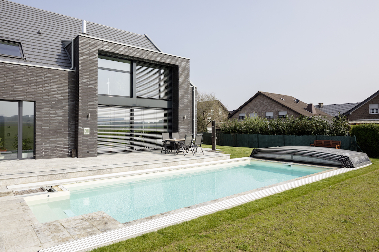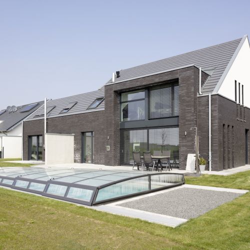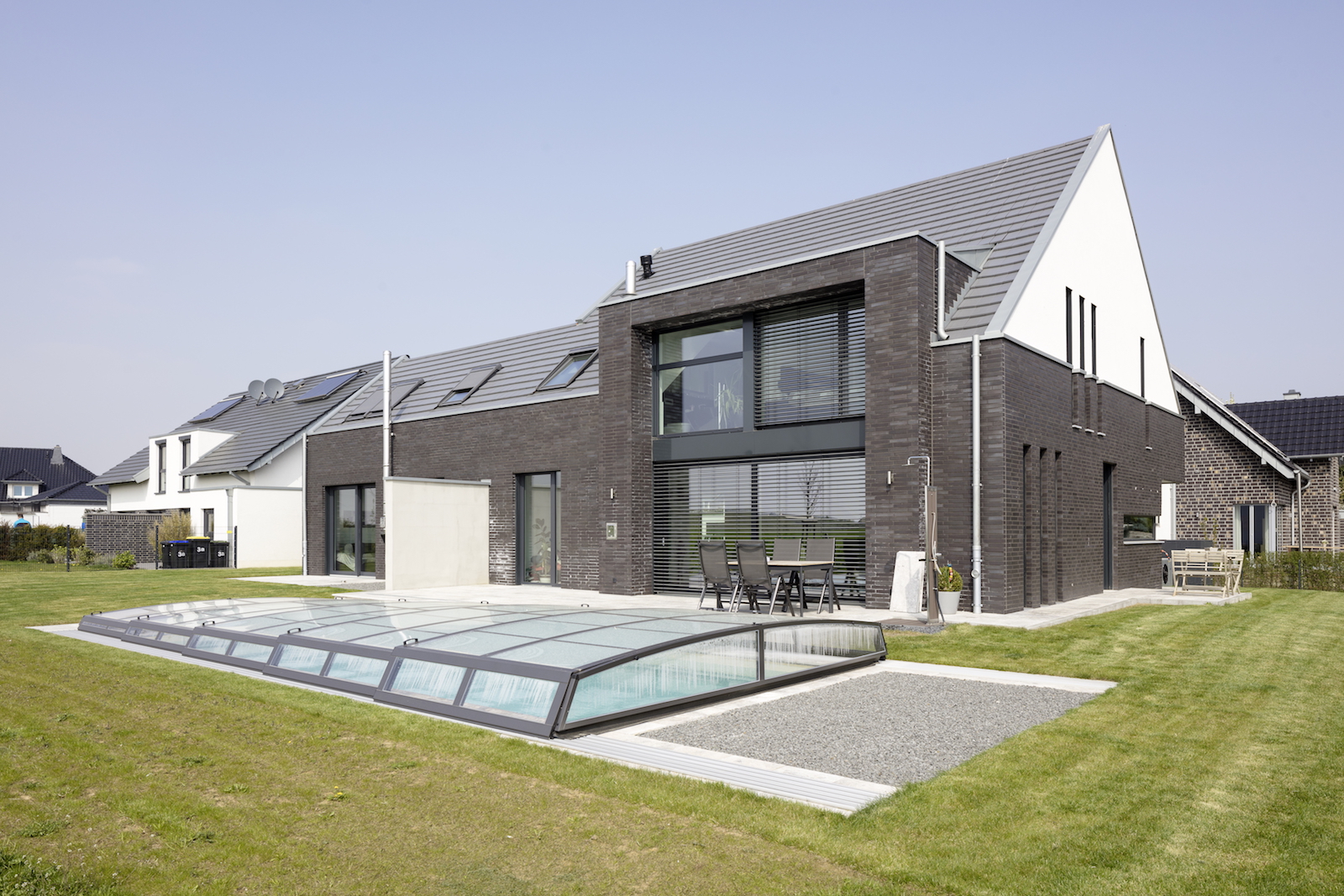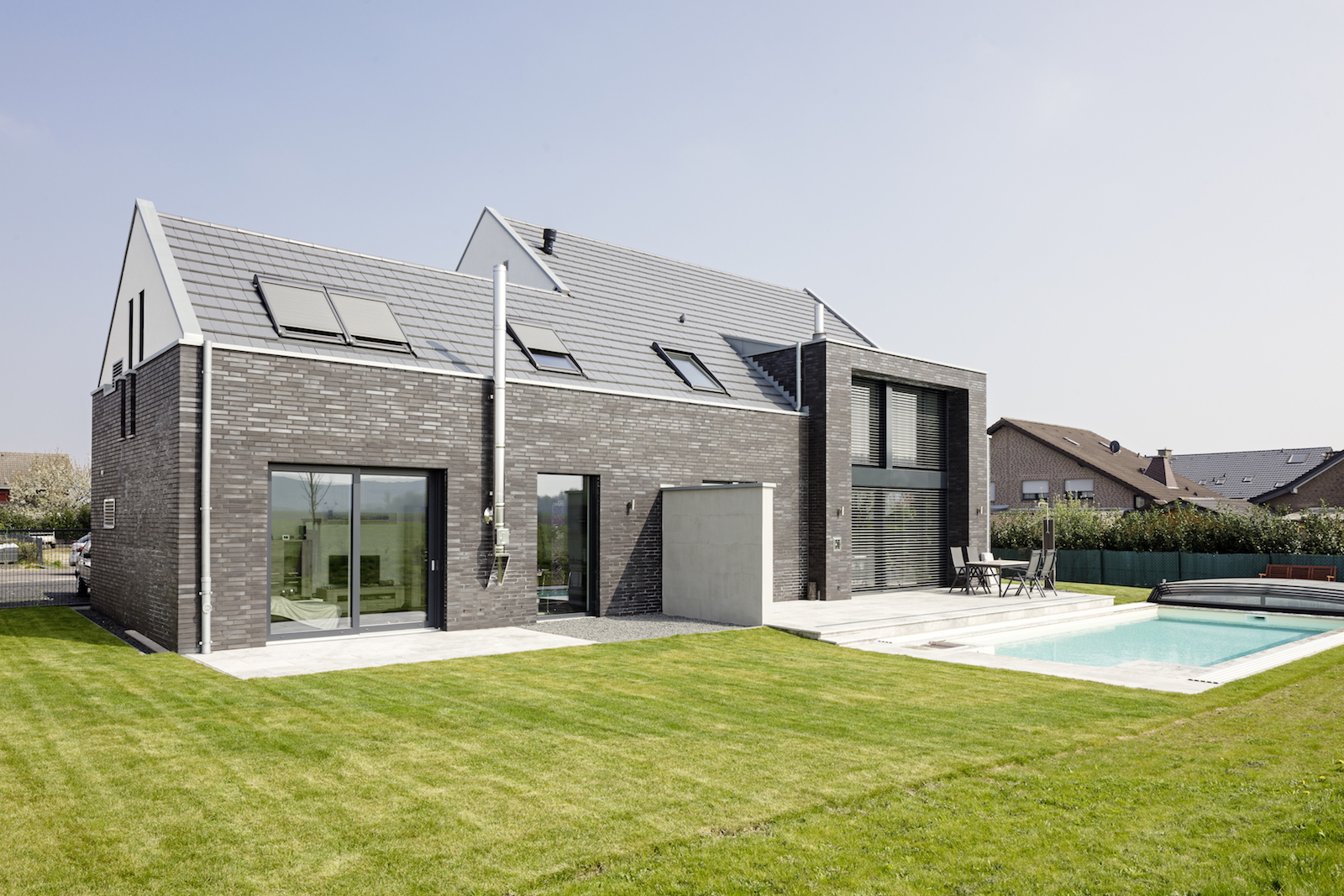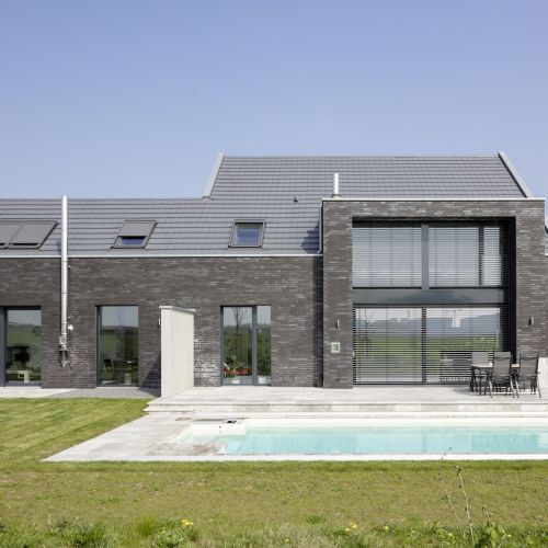 Die Fassade ist in einem Wechsel mit schwarzen Klinkersteinen und weissen Putz kontrastreich gestaltet.