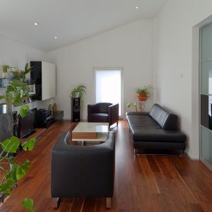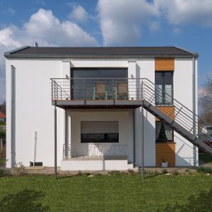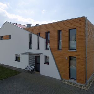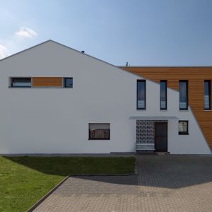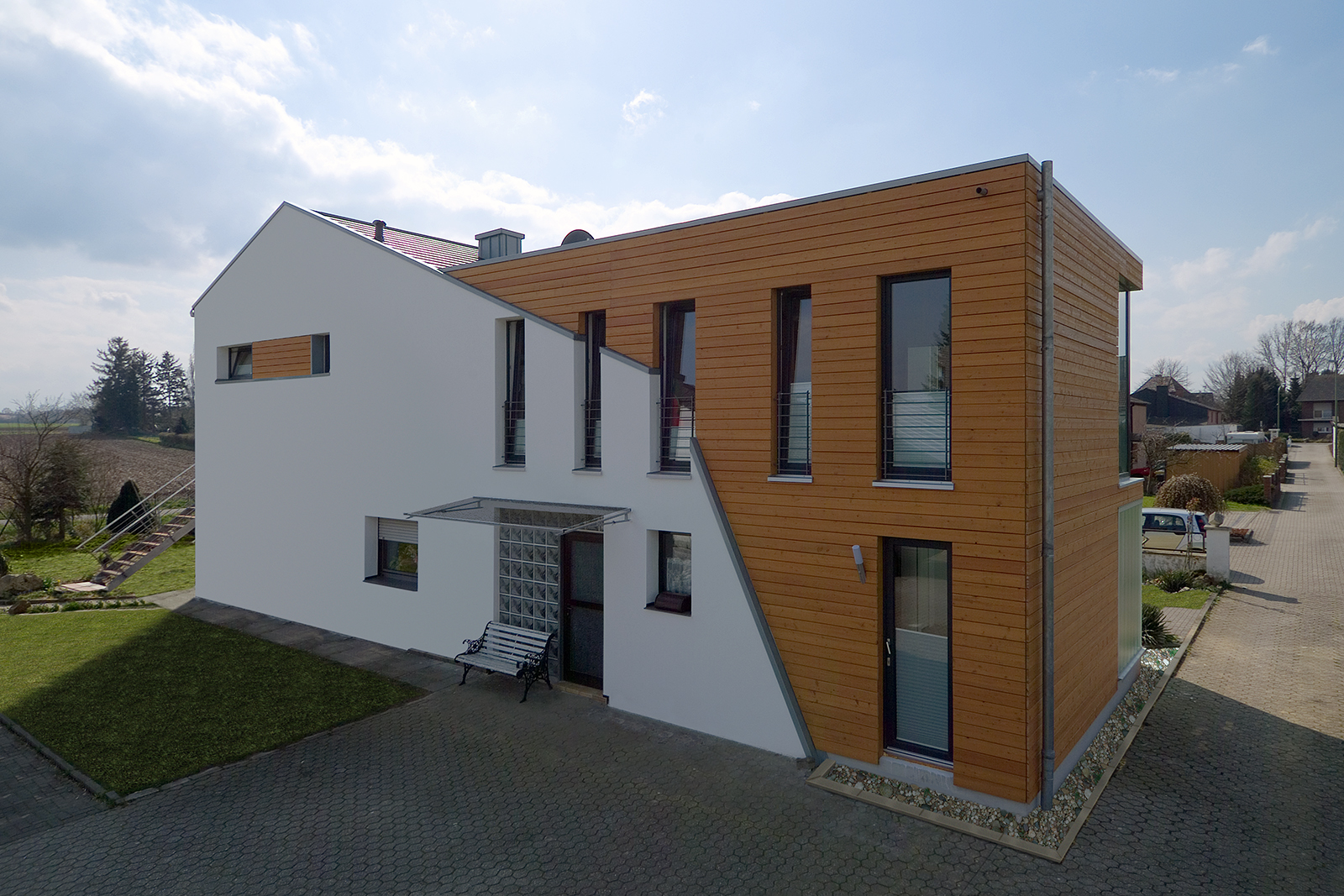 Ziel dieser Sanierungsaufgabe war es zum Einen das 1958 gebaute Einfamilienhaus in ein Zweifamilienhaus umzuwandeln, jedoch die Charakteristik des Ursprungbaus zu erhalten. Dies gelang konstruktiv zunächst durch einen Teilabriss des Erdgeschosses und einer Aufstockung des eingeschossigen Bereiches. Der so neu entstandene zweigeschossige Gebäudeteil wurde mit einer Lärchenholzverkleidung aus Trapezprofilbrettern versehen. Dieses Material zieht sich durch das gesamte Haus auch im Bereich des Bestandes.