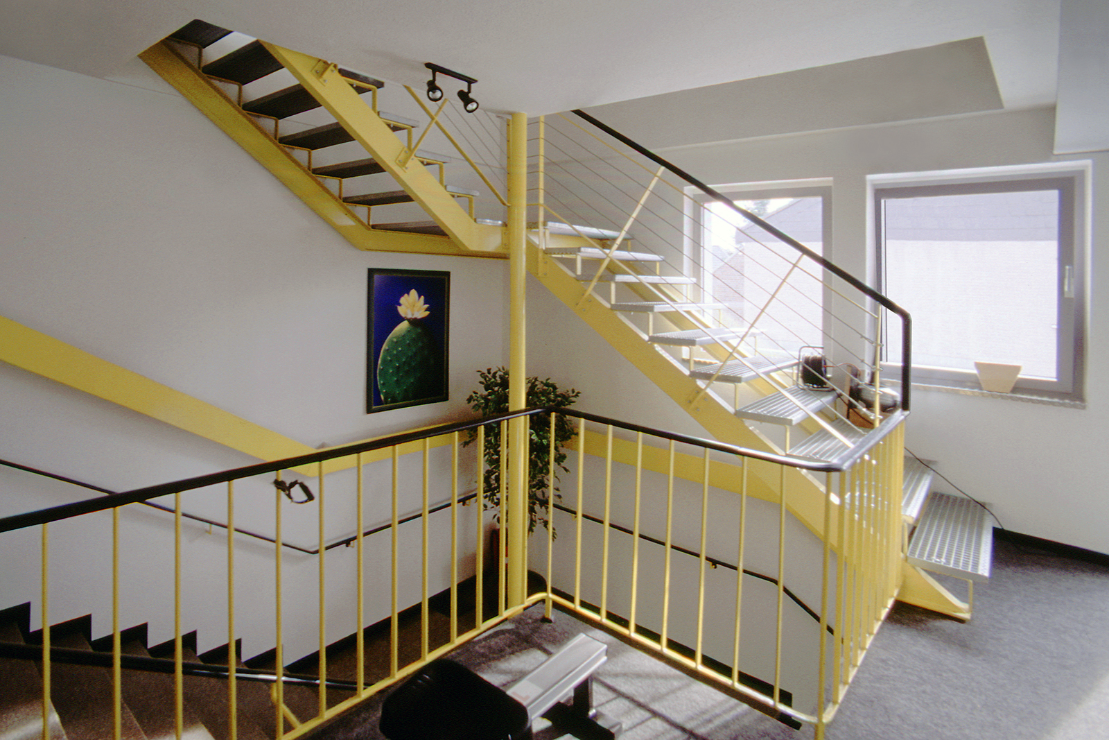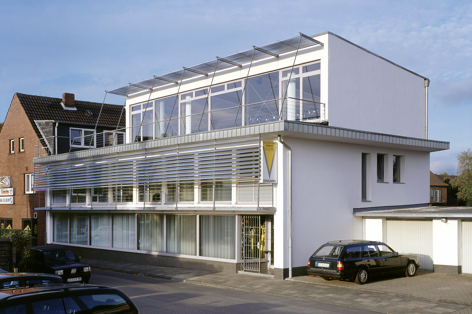 Bei dem bestehenden Gebäude handelte es sich um einen zweigeschossigen Baukörper mit Flachdach, der 1965 errichtet wurde. Die Aufstockung brachte vor allem statische Probleme mit sich, da eine Belastung der bestehenden Decke nicht mehr möglich war. Die entstehenden Lasten mussten über die einzelnen Stützen abgefangen werden. Im Zuge der Erweiterungsmaßnahmen wurden alle Fassaden und die komplette Fensteranlage des bereits bestehenden Gebäudes saniert. Bei den Umbaumaßnahmen im Inneren des Gebäudes handelt es sich um eine Erweiterung der Empore innerhalb des bestehenden Gebäudes. Für die Emporen wurden filigrane Stahlkonstruktionen gewählt um den Lichteinfall in das Erdgeschoss zu erhalten.