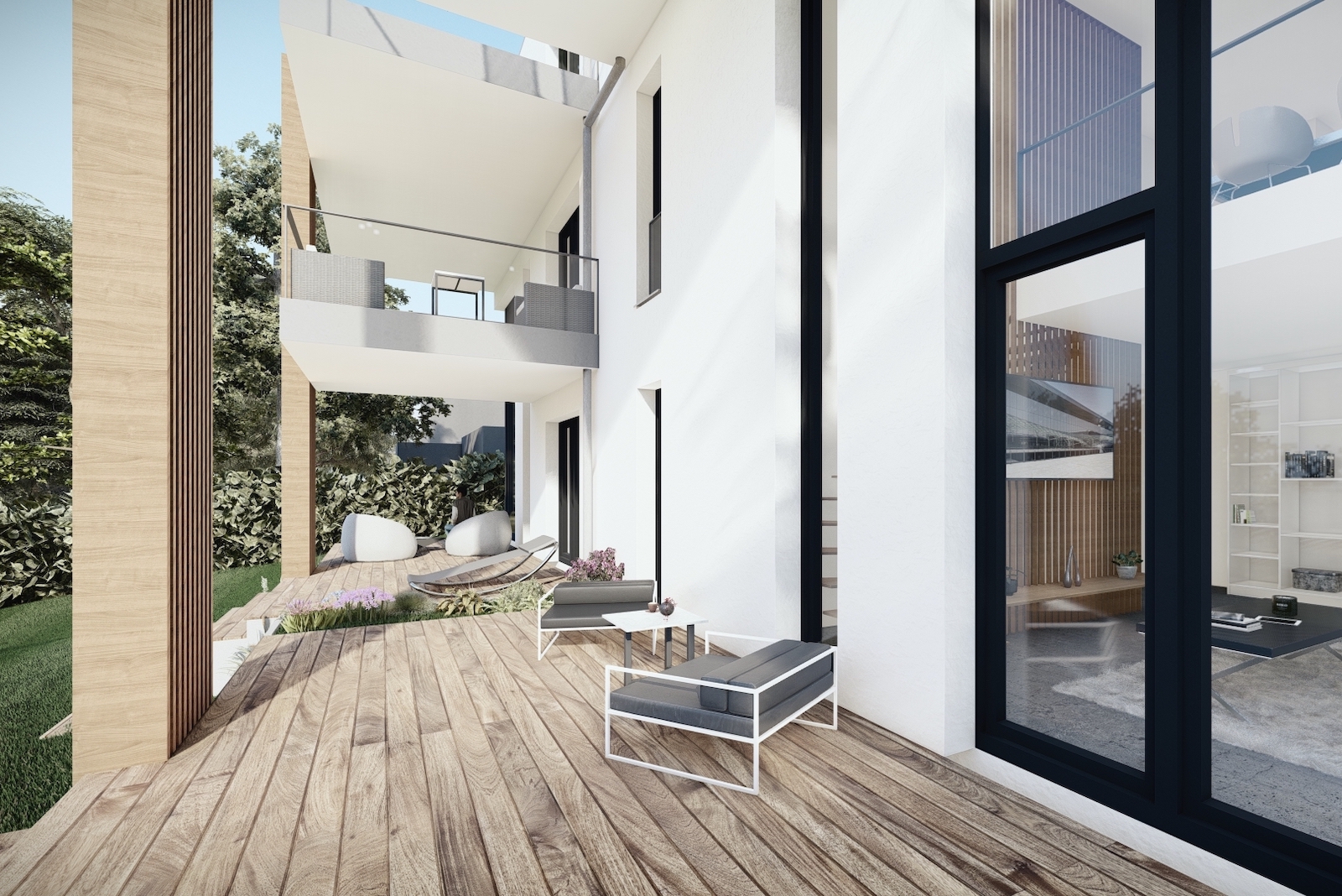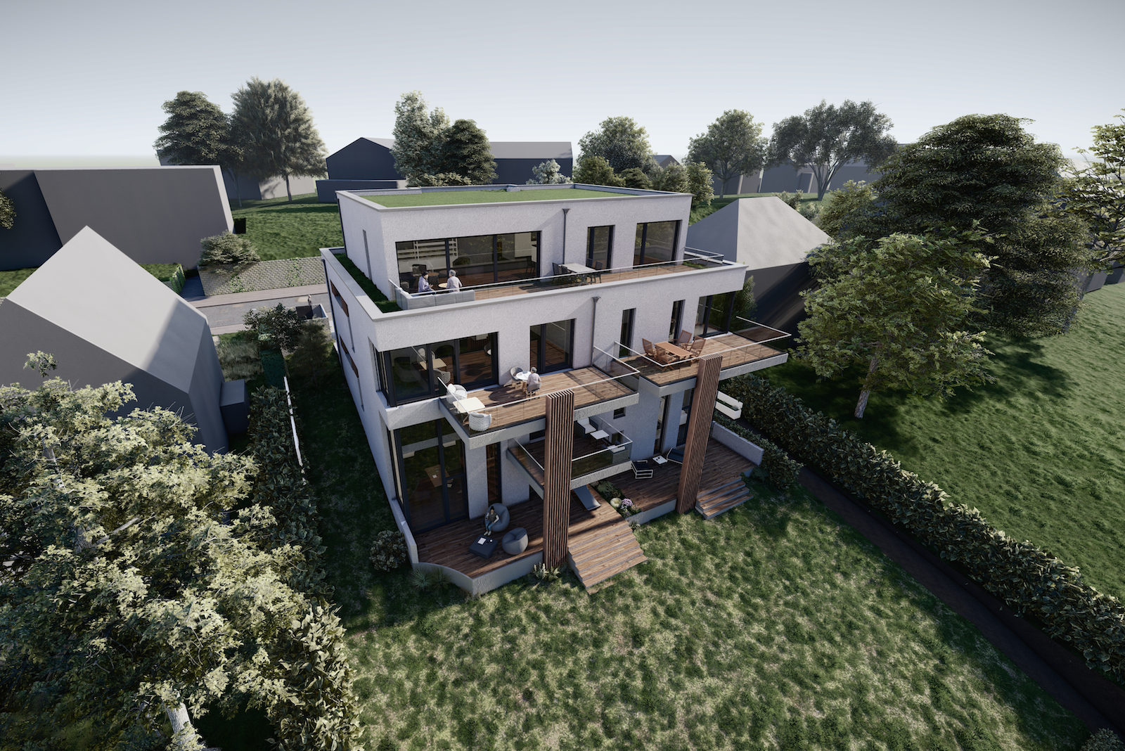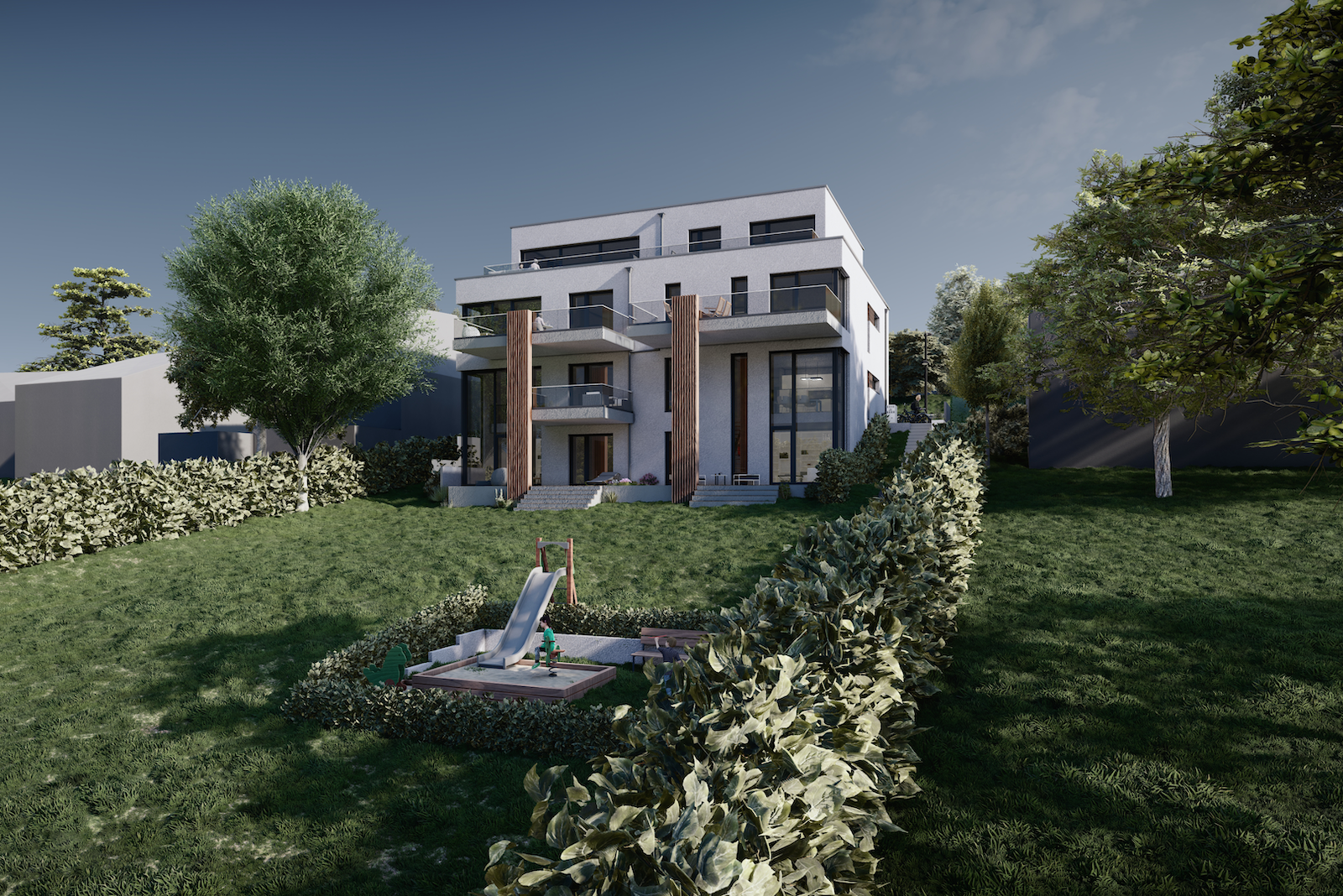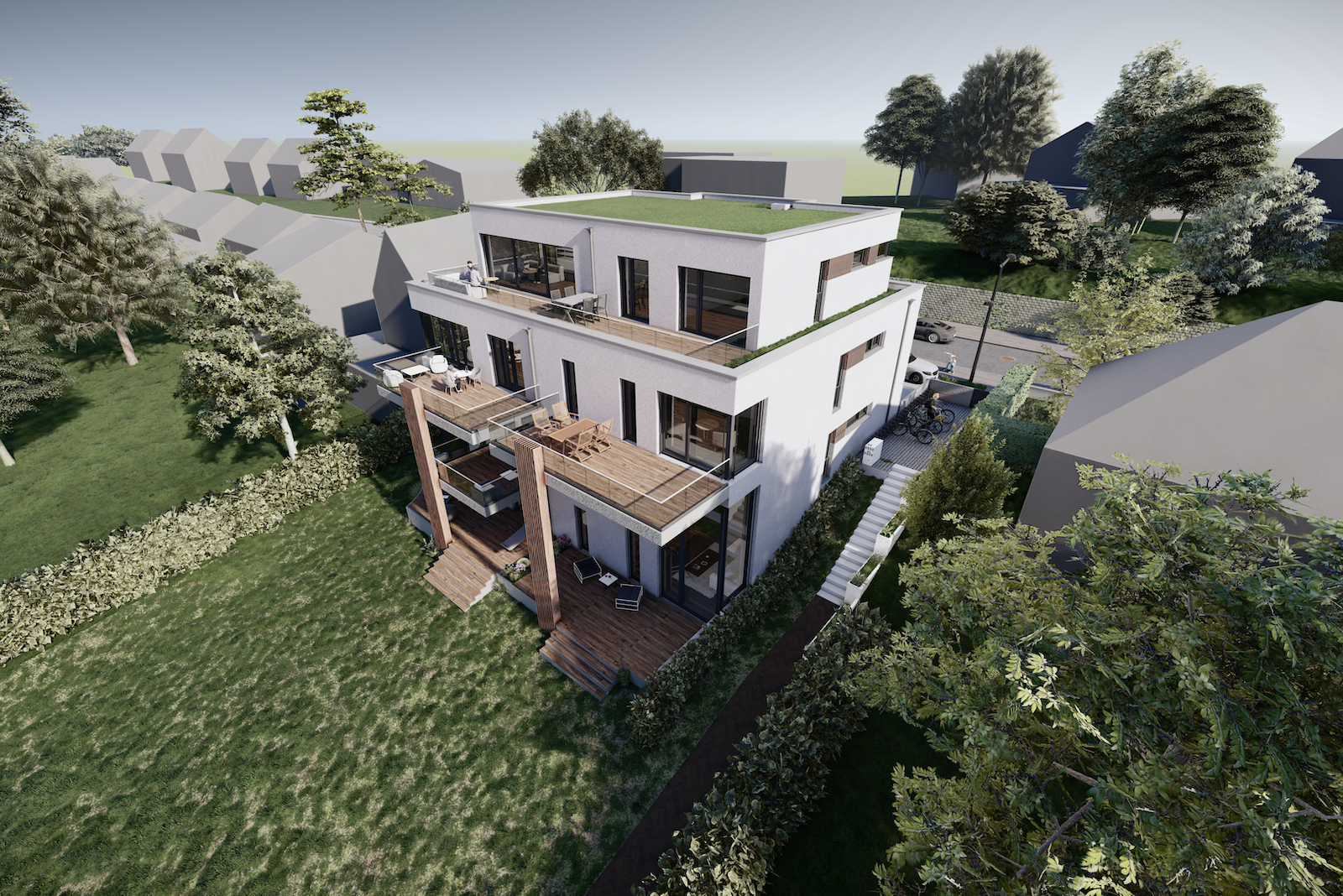 Es ergibt sich eine Gesamtwohnfläche von etwa 615m2. Das Gebäude wird komplett unterkellert und mit großzügigen Terrassen ausgestattet. Jede Wohneinheit hat ihren Stellplatz vor dem Haus.
