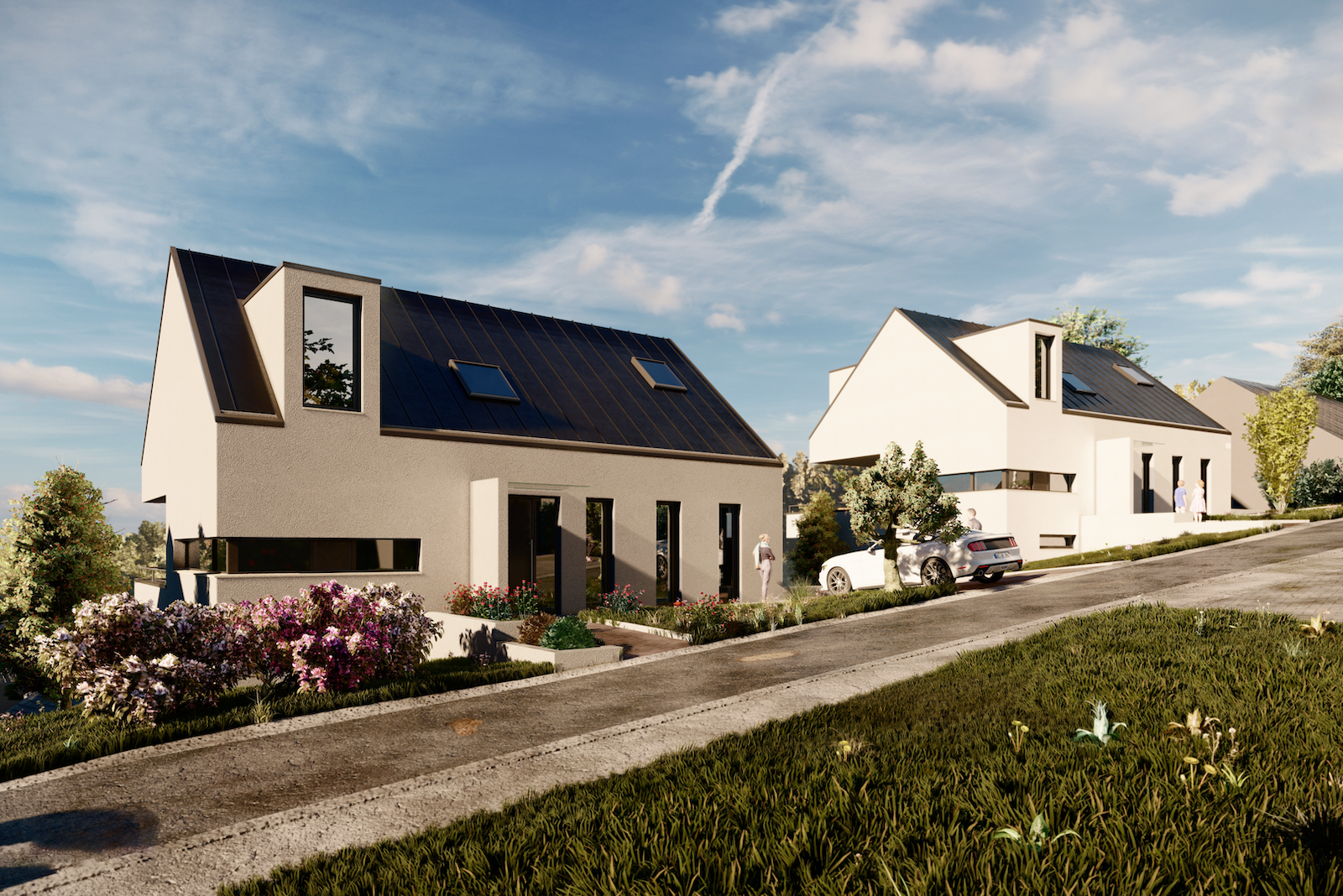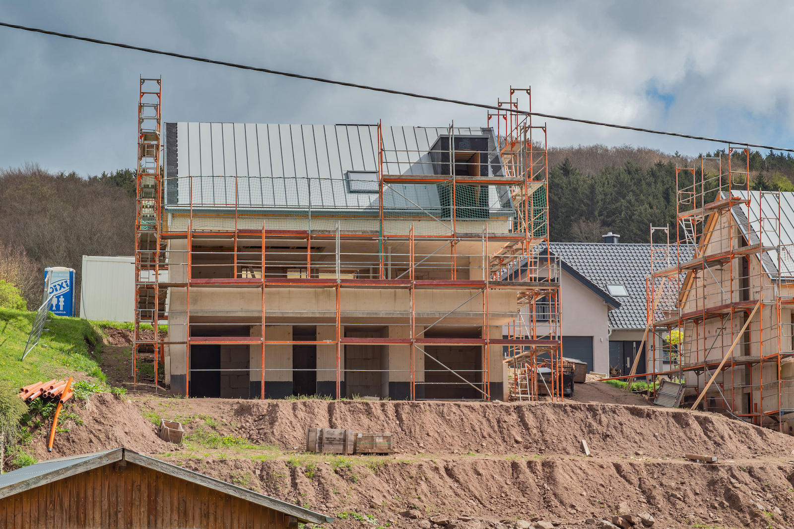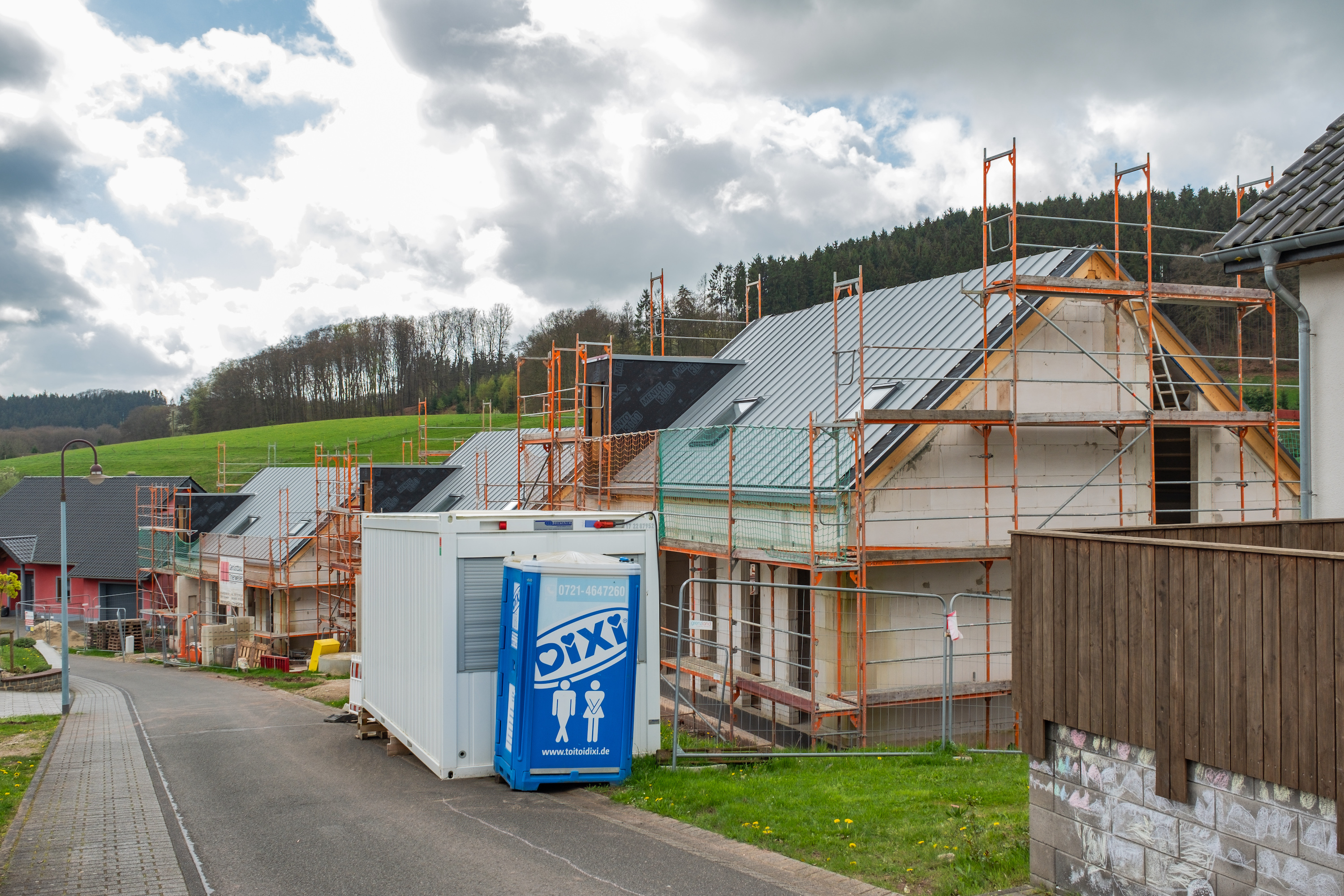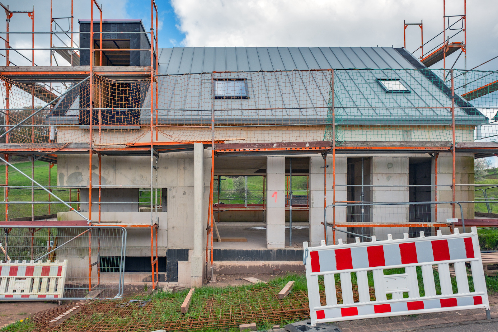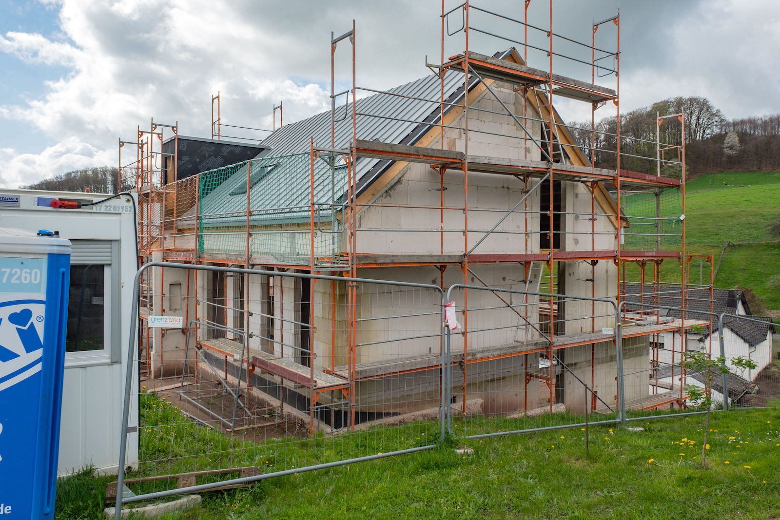 In Utscheid Rheinland-Pfalz entstehen diese drei Einfamilienhäuser mit einer Wohnfläche von je 220 m². Die drei Gebäude befinden sich in einer steilen Hanglage und sind damit prädestiniert für eine Souterrain-Planung, daher sind die Gebäude komplett unterkellert. Im Rahmen der Gestaltung der Außenanlagen werden die Vorgaben der Gemeinde zur Landschaftsplanung eingehalten und Hecken gepflanzt.