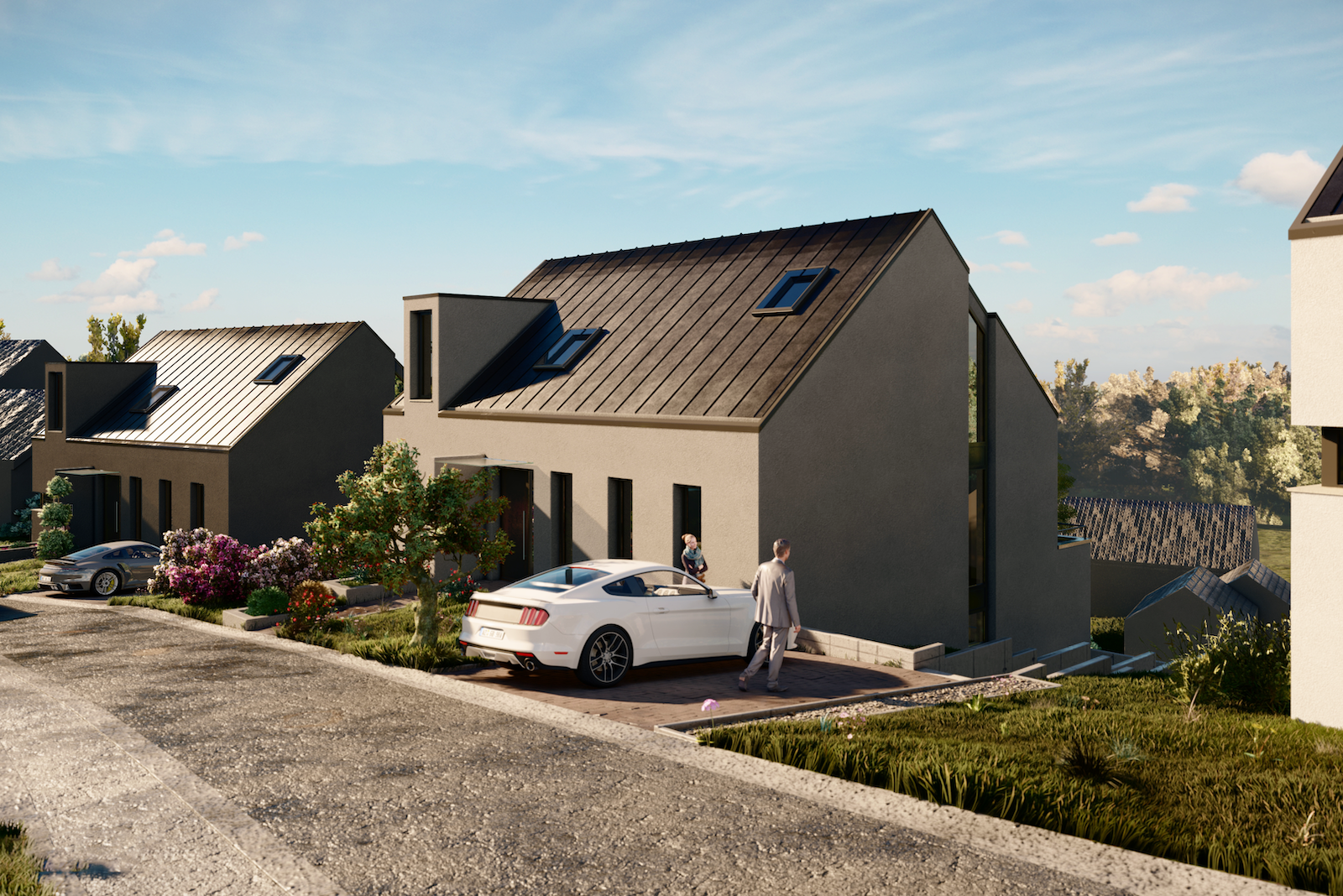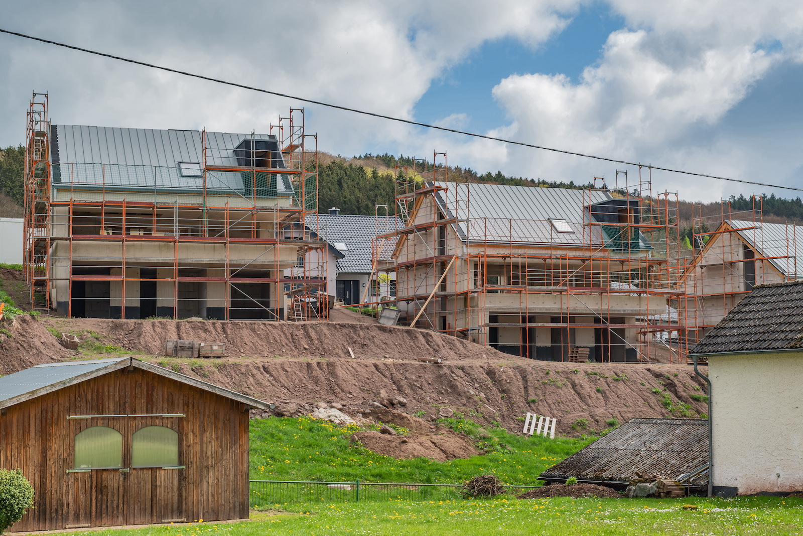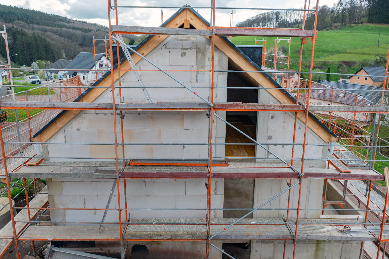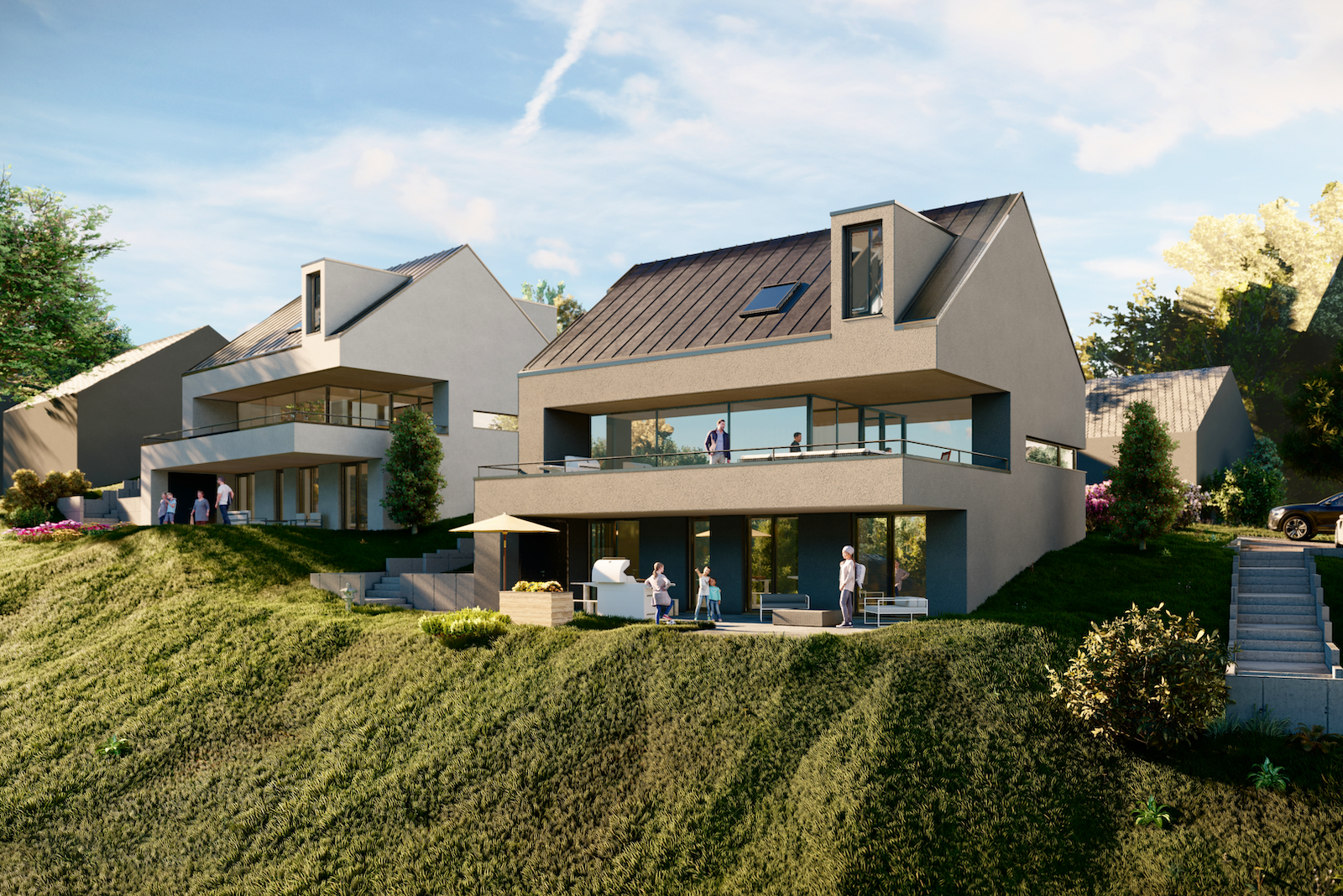 In Utscheid Rheinland-Pfalz entstehen diese drei Einfamilienhäuser mit einer Wohnfläche von je 220 m². Die drei Gebäude befinden sich in einer steilen Hanglage und sind damit prädestiniert für eine Souterrain-Planung, daher sind die Gebäude komplett unterkellert. Im Rahmen der Gestaltung der Außenanlagen werden die Vorgaben der Gemeinde zur Landschaftsplanung eingehalten und Hecken gepflanzt.