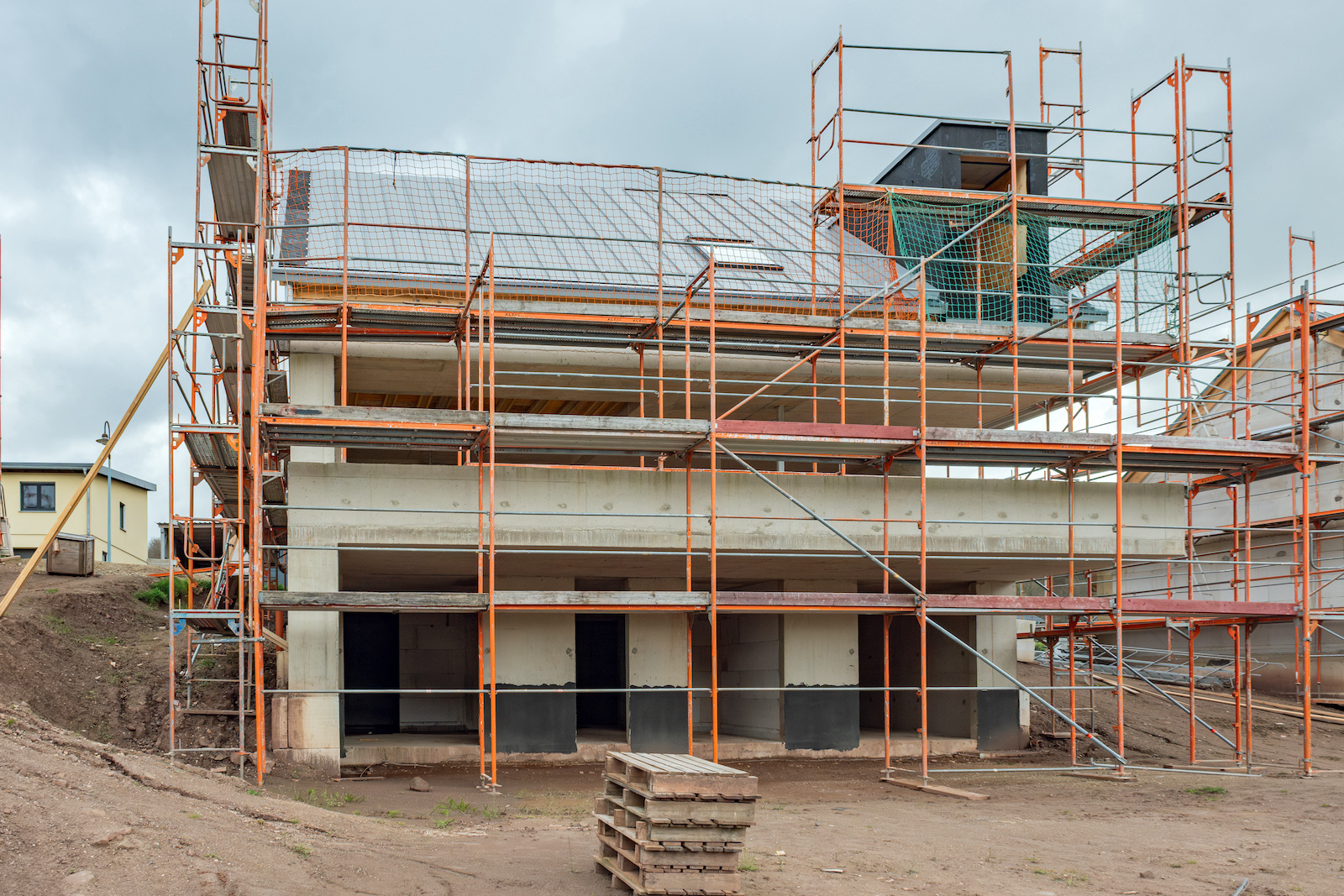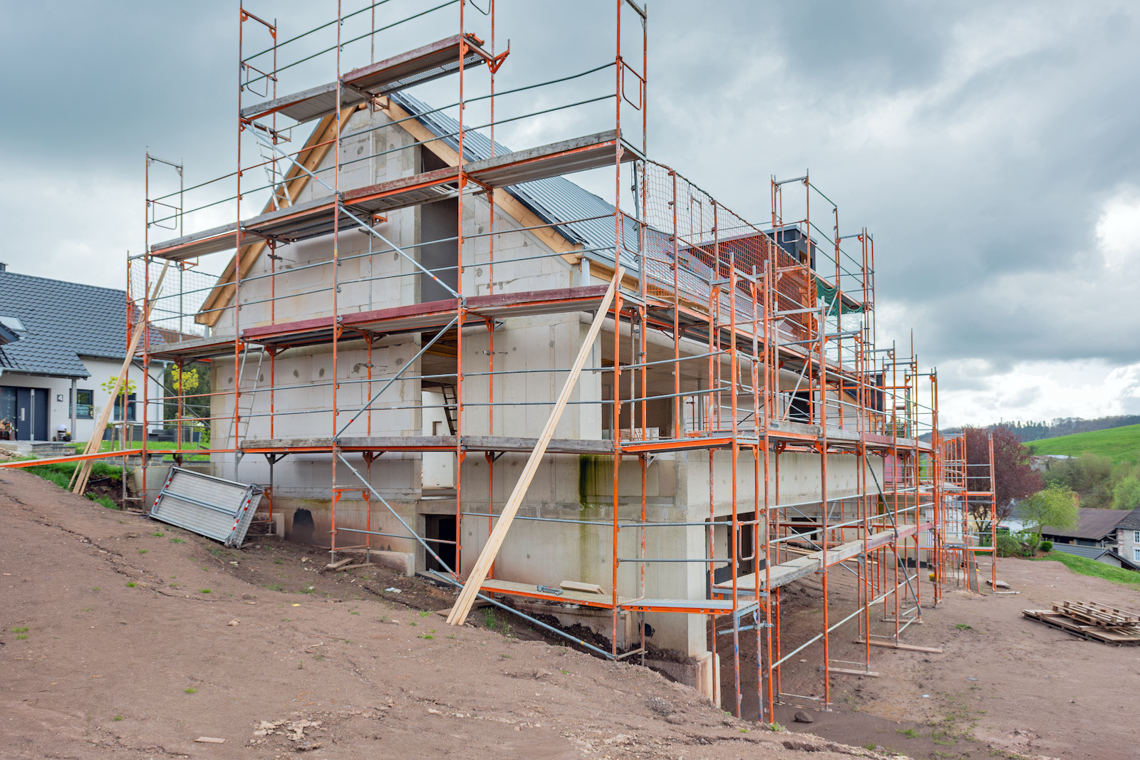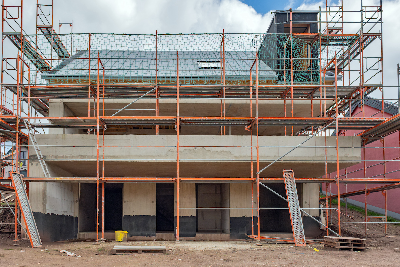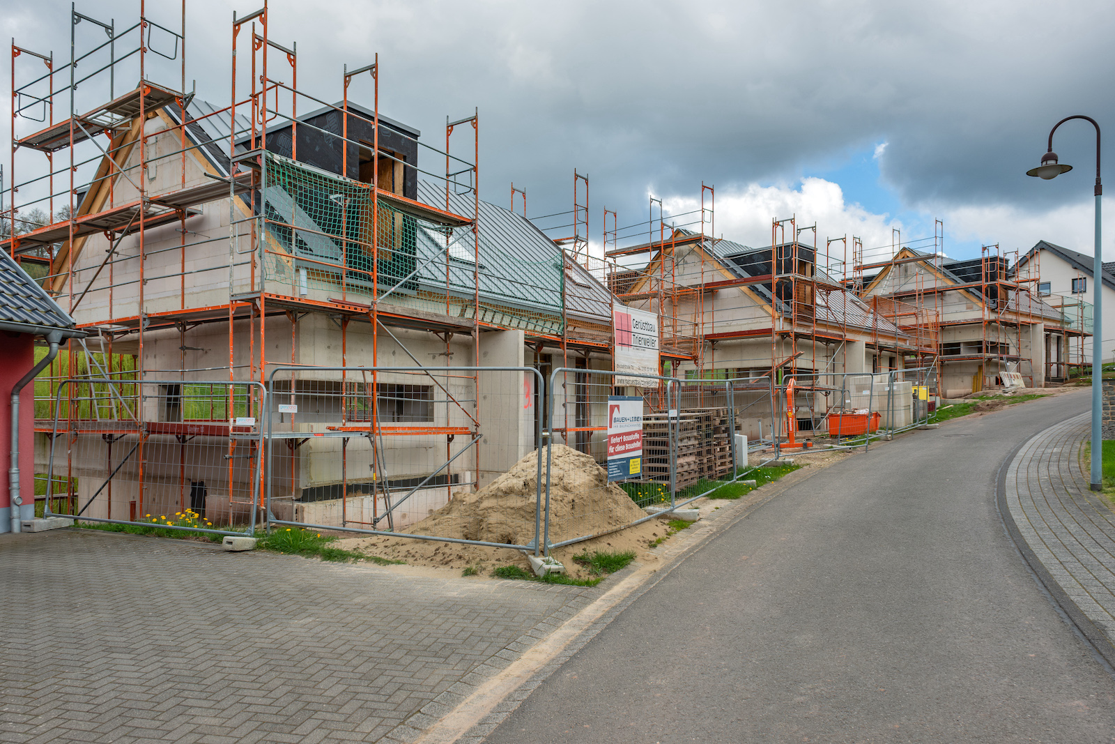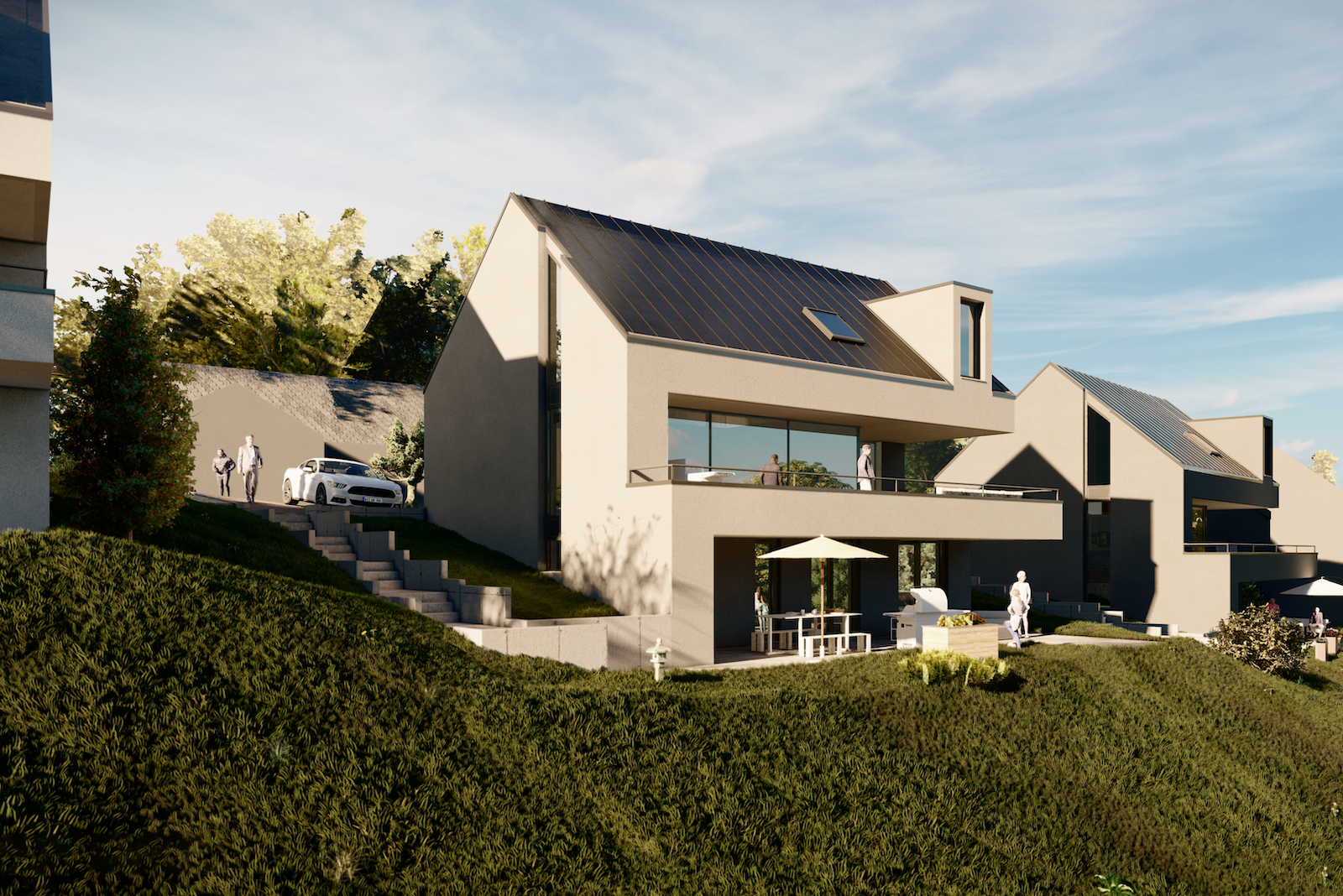 In Utscheid Rheinland-Pfalz entstehen diese drei Einfamilienhäuser mit einer Wohnfläche von je 220 m². Die drei Gebäude befinden sich in einer steilen Hanglage und sind damit prädestiniert für eine Souterrain-Planung, daher sind die Gebäude komplett unterkellert. Im Rahmen der Gestaltung der Außenanlagen werden die Vorgaben der Gemeinde zur Landschaftsplanung eingehalten und Hecken gepflanzt.