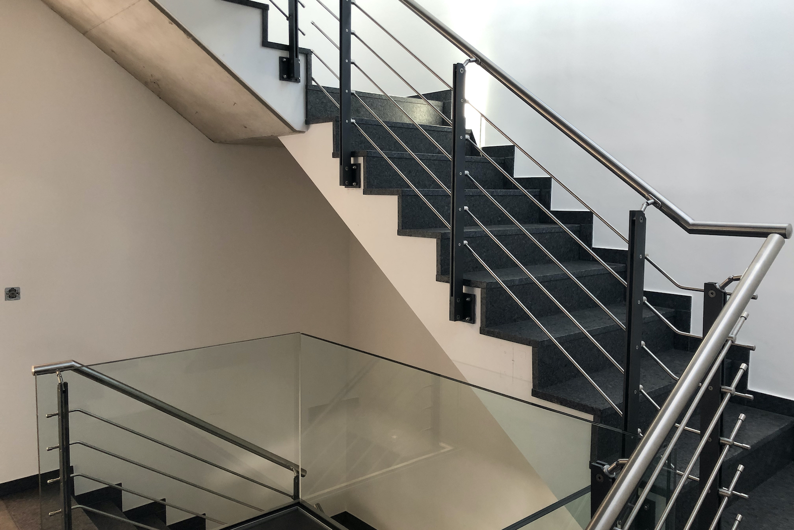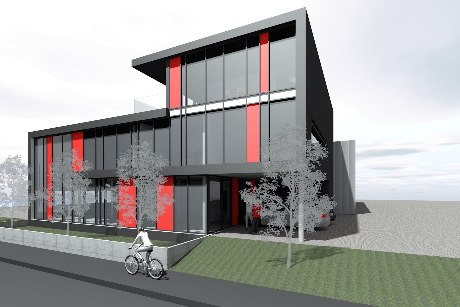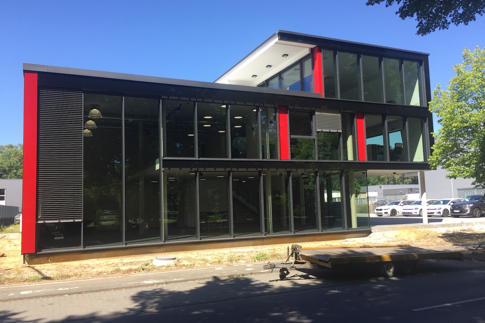 Das dreigeschossige Verwaltungsgebäude wurde zur Strassenseite mit einem Pfosten Riegel System komplett verglast. Die Produktionsstätte wurde als Stahlhalle mit Sandwichpaneelen erstellt.