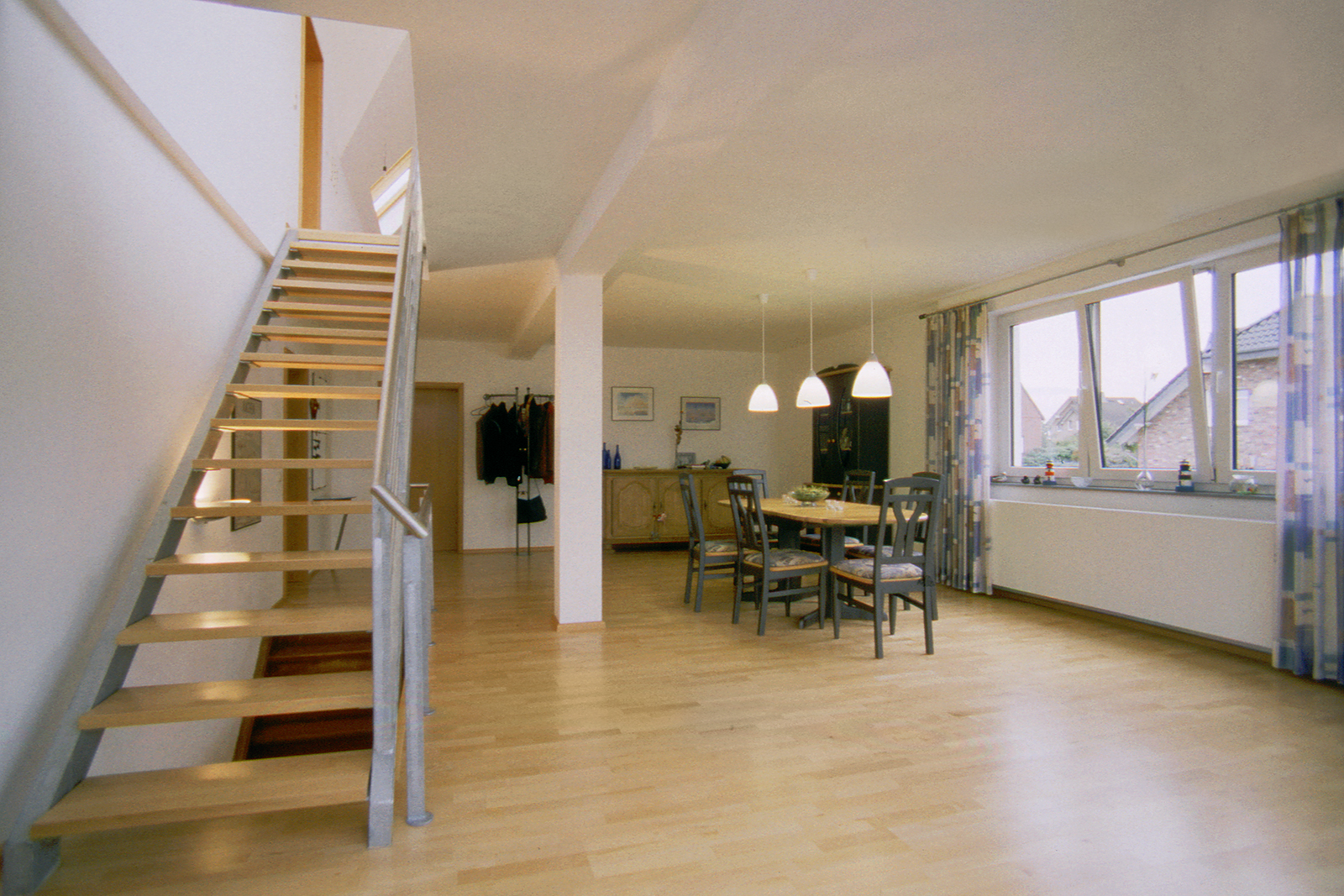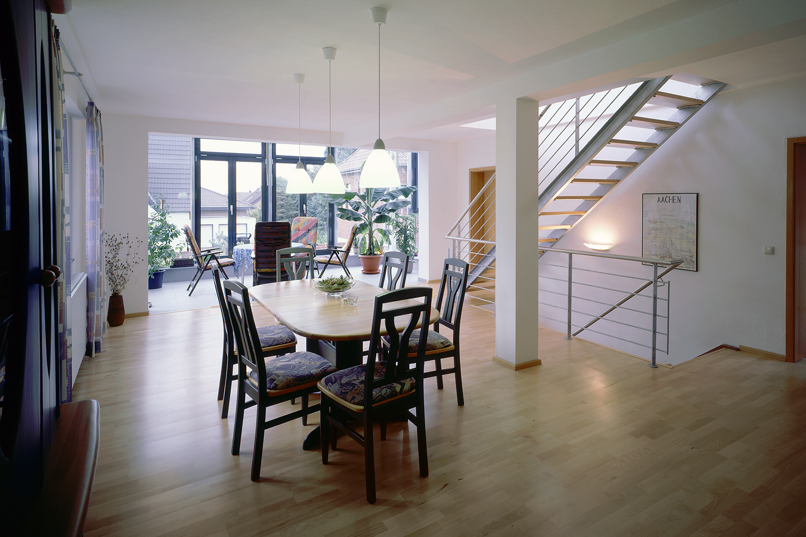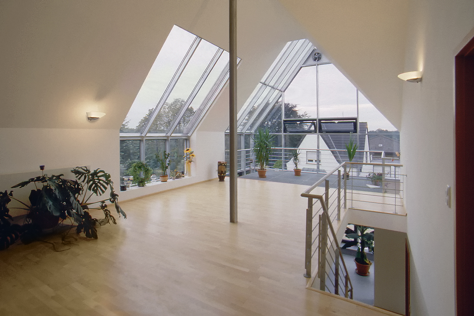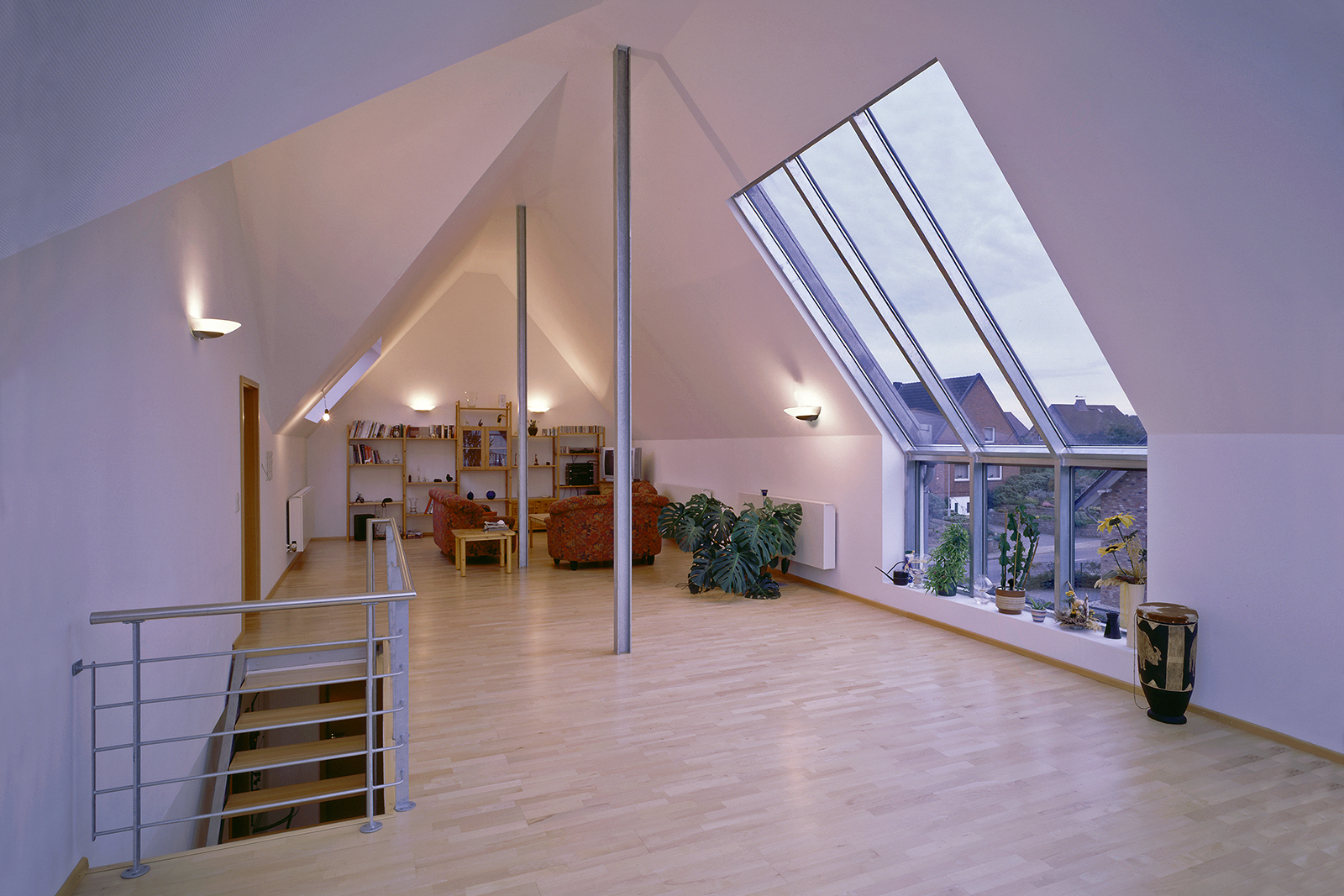 Um ein festgesetztes Budget nicht zu überschreiten, wurden mehrere Varianten kalkulatorisch durchgearbeitet. Hierbei spielte vor allem die Konstruktion des Wintergartens eine erhebliche Rolle. Die Empore im Wintergarten bleibt mit verzinkten Gitterrosten transparent. Es entsteht eine Wohnung auf zwei Ebenen mit nahezu 200 m2 Wohnfläche.
