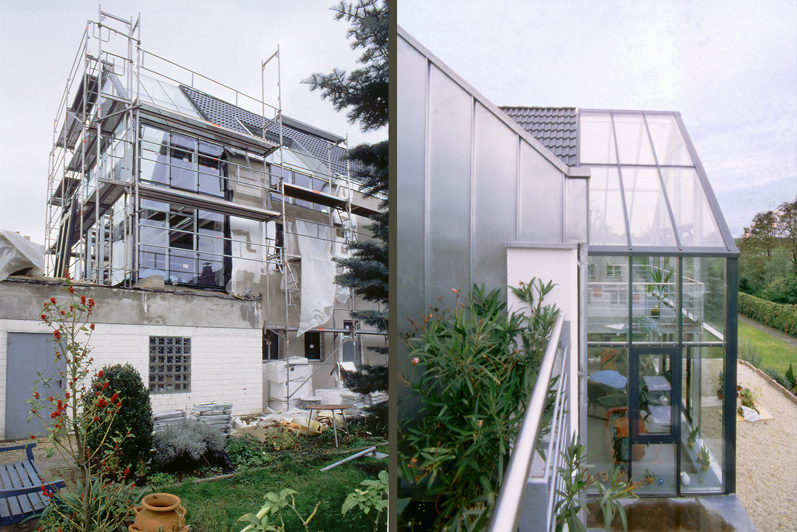 Das Dachgeschoss, das bislang ausschließlich als Speicher genutzt wurde, wurde komplett entfernt, neu errichtet und mit einem zweigeschossigen Wintergarten an der südwestlichen Seite des Altbaues erweitert.