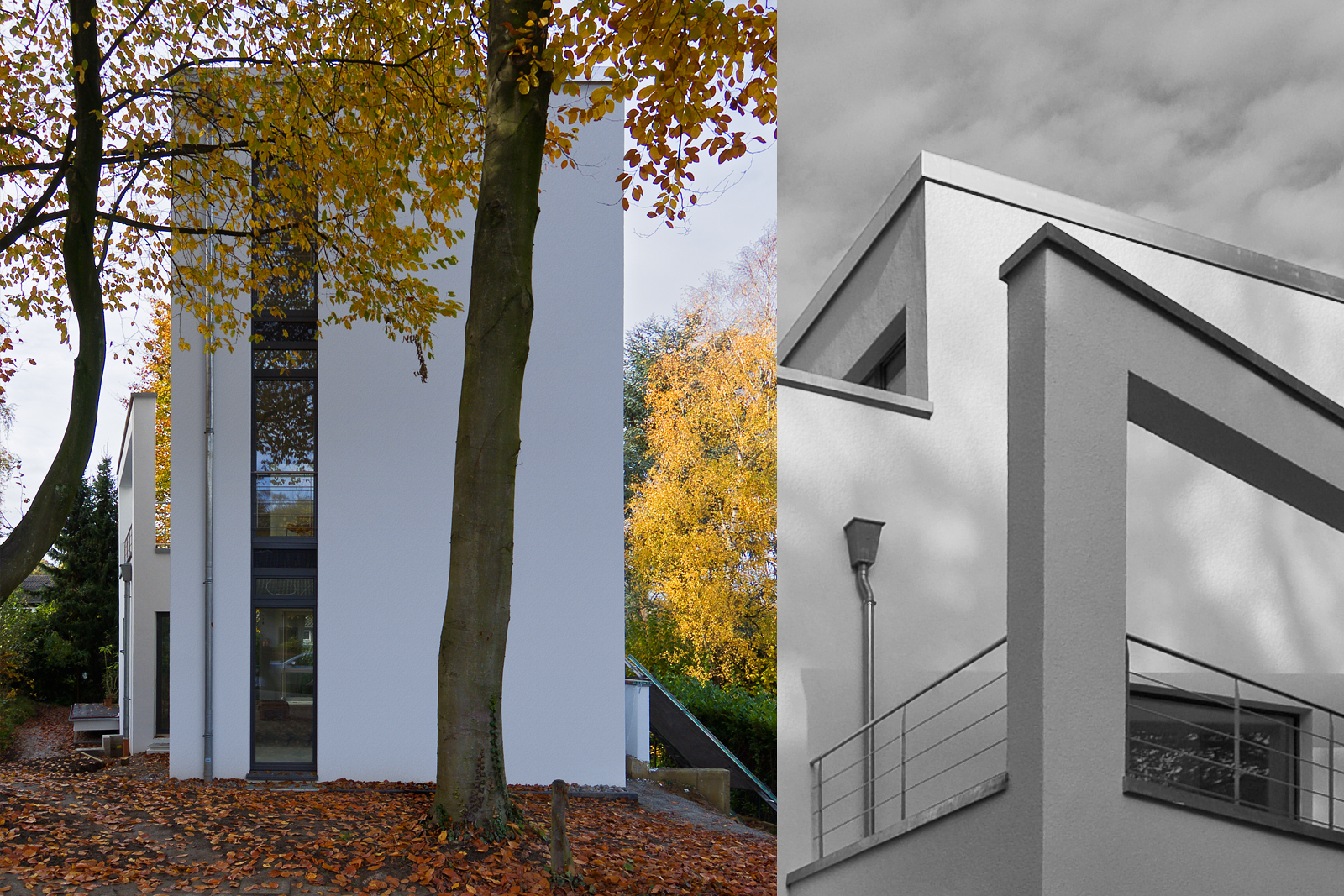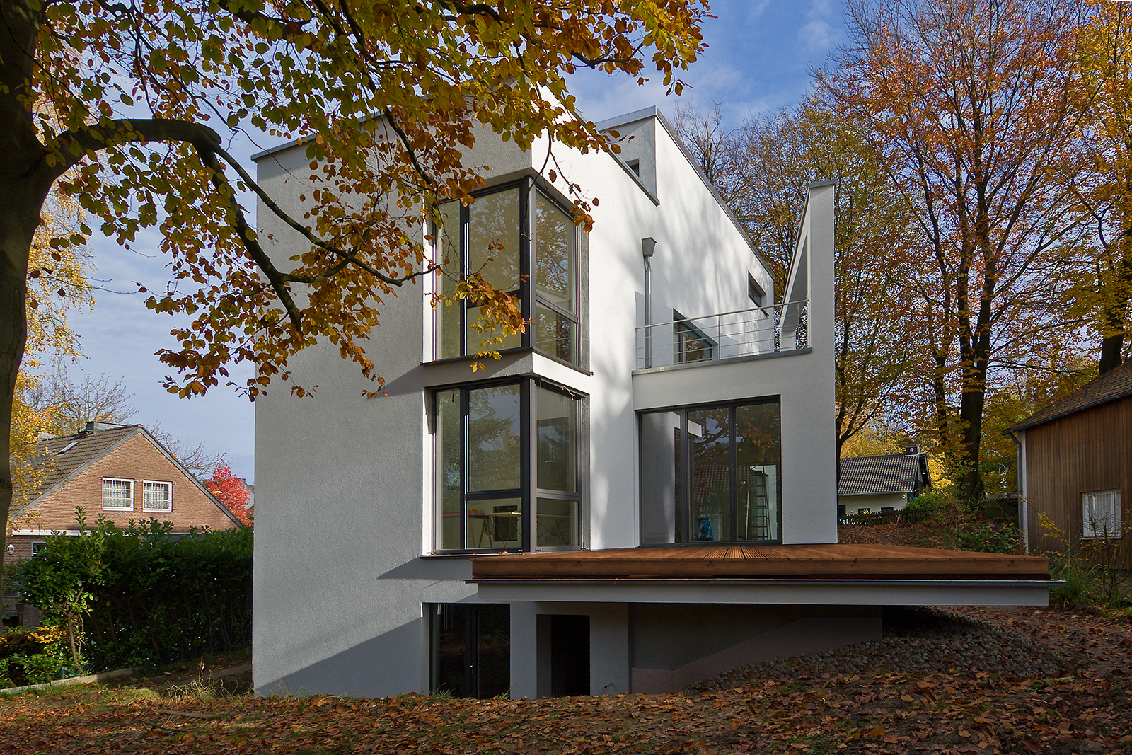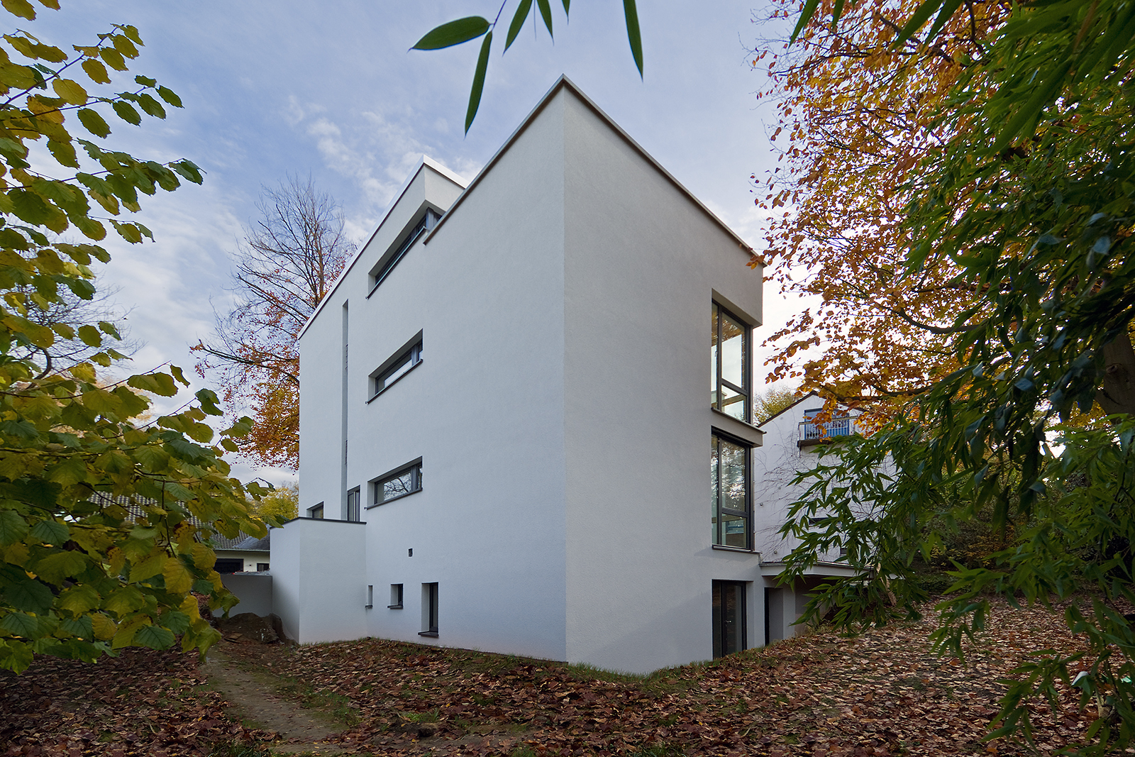 Das Grundstück der Bauherren befindet sich im Aachener Süden. Bei der Umsetzung des Objektes war insbesondere der Baumschutz als größte Hürde spürbar. Das Gebäude ist massiv errichtet. Der Wärmeschutz wird durch ein Wärmedämmverbundsystem, sowie durch Holz-Aluminium Fenster erreicht. Das Gebäude ist unterkellert, hat zwei Vollgeschosse und ein Dachgeschoss mit Flachdach. Jede Ebene hat eine eigene Terrasse. Da das Haus im Hang steht, ist das Kellergeschoss im Bereich des Gartens auf Eingangsniveau erreichbar. Hier befindet sich noch eine Einliegerwohnung, die durch einen separaten Eingang zugänglich ist.